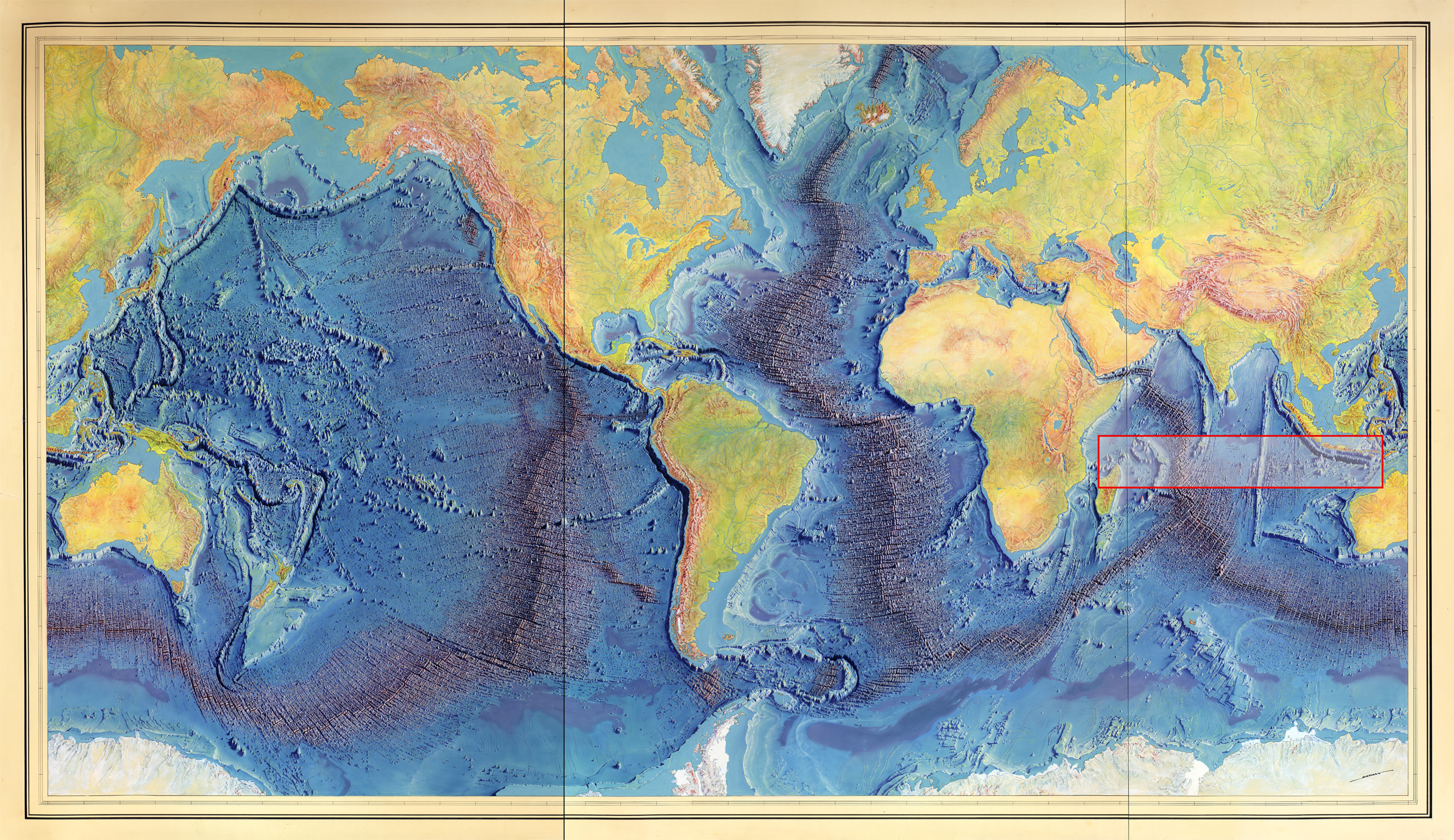It is part of a scientific hand drawn map (full map below) by geologist and oceanographic cartographer Marie Tharp. She used oceanographer Bruce Charles Heezen’s depth measurements and plotted the points in physiographic diagrams. The was published in 1977 by the office of Naval Research, USA and is still in wide use today.